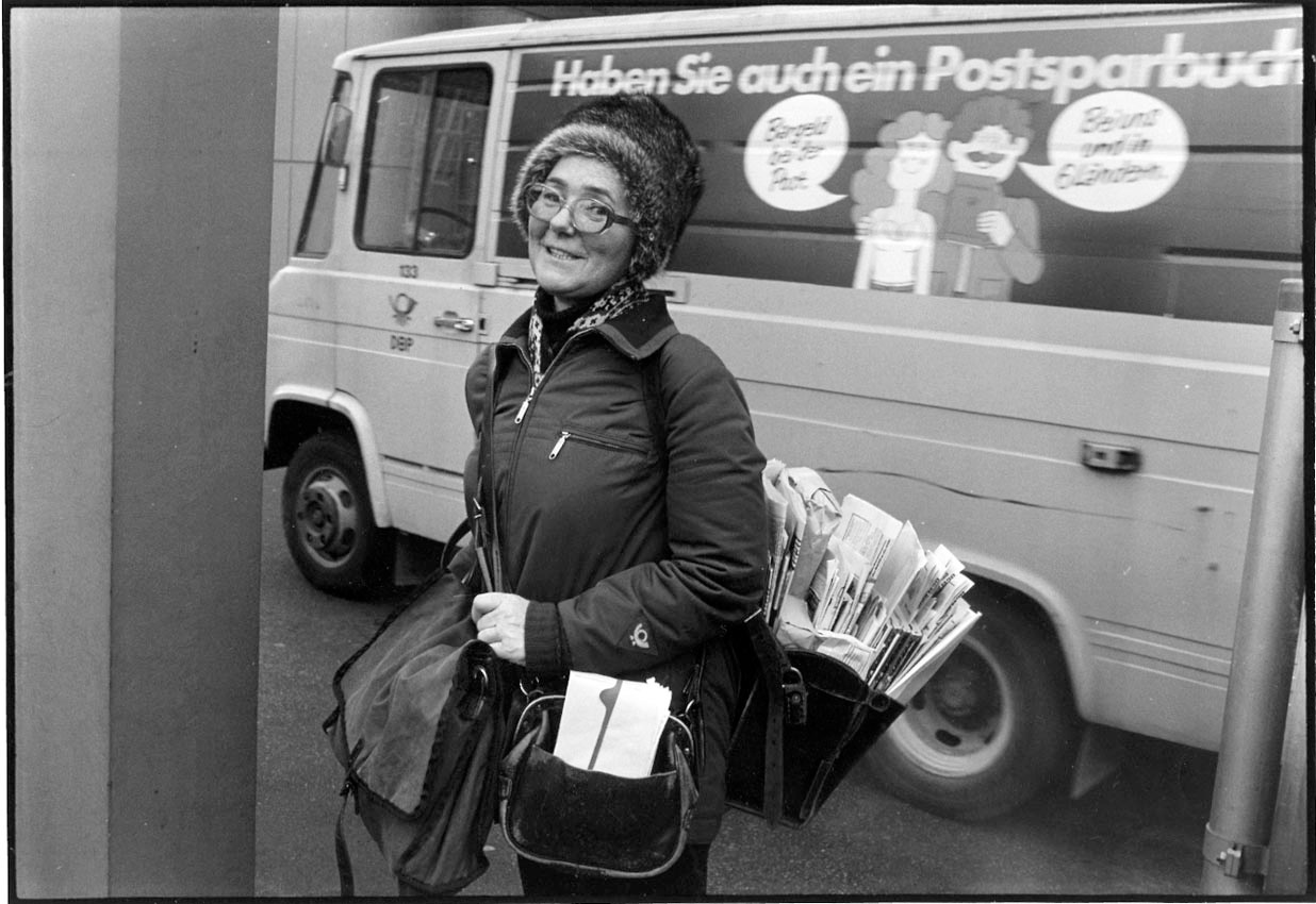 Briefe und Sendungen trägt sie im Rücken, die Tasche in der Hand. Weibliche Arbeit im öffentlichen Raum wird sichtbar als Teil gesellschaftlicher Versorgung – leise, kontinuierlich, körperlich präsent.